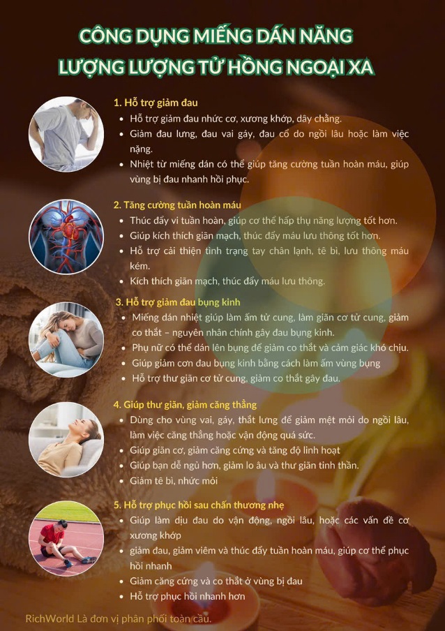 Miếng dán năng lượng lượng tử hồng ngoại xa là công nghệ trị liệu không dùng thuốc, ứng dụng cộng hưởng tần số lượng tử và tia hồng ngoại xa (FIR) giúp giảm đau, thư giãn cơ bắp và tăng tuần hoàn máu một cách tự nhiên. Với khả năng xâm nhập sâu vào mô da 3–5cm, sản phẩm mang lại hiệu quả nhanh chóng mà không gây tác dụng phụ lên gan, thận hay hệ tiêu hóa.