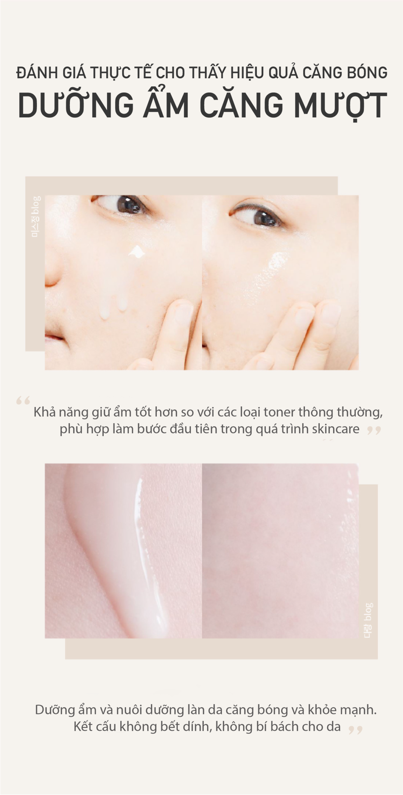 1. Hiệu ứng Glass Skin tức thì: Ngay sau khi vỗ toner, da bóng khỏe tự nhiên (bóng dầu và bóng khỏe là hai khái niệm khác nhau).